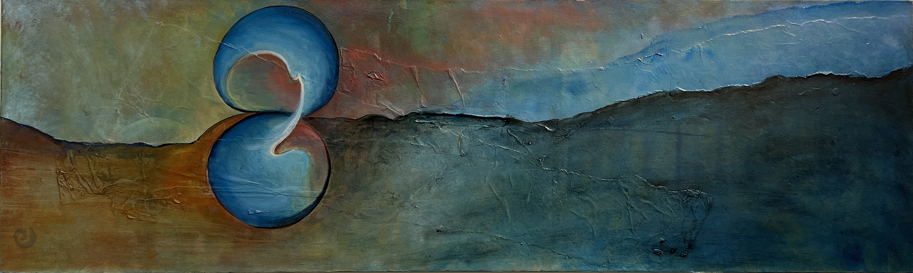 Something Old, Something New". . . a show of paintings, prints, and one mixed media work. Included are woodblocks of intricate, nautilus-like forms underwater and a “Tsunami” in which loosely painted waves crest behind a hard-edge globe. That picture’s contrast between surges and circles continues in “Just Another Cloudy Day in May,” a striking triptych in which the center panel is higher than the two flanking it. If Jakes’s landscapes don’t present philosophical or environmental parables, their ingenious compositions have a narrative flair." Mark Jenkins The Washington Post, May 12, 2022 |